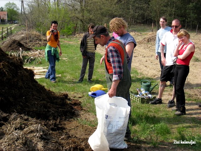 A munkákat illetően foglalkoztunk veteményezéssel, ásással, krumpli ültetéssel, kapálással, komposztálással, a föld megszentelésével. Mátyás hosszú évek óta komposztálja a szerves hulladékokat, módszere már-már tudományos. Saját gazdaságában Fülöpjakabon mintegy 40 féle növényt termesztenek, ennek ellenére a keletkezett zöld hulladék nem elég a talajbaktériumok táplálására. Ezért olyan gazdaságból vásárolnak szerves trágyát, ahol nem használnak semmiféle vegyszert. Ezt megfelelően beoltva (magának a beoltási folyamatnak mi is szemtanúi lehettünk), a növények alá félig vagy teljesen érett komposzttal együtt adják. Ötféle preparátummal oltják be a komposzthalmot, amely a termofil fázisban fölmelegedhet 70-80 Celsius fokra. Ha azonban biodinamikus preparátumokkal oltják be, akkor ez a hőmérséklet 60 Celsius fok fölé nem emelkedik.