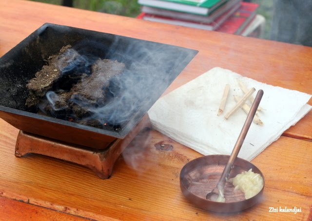 A föld megszenteléséhez szükséges anyagok elégetve: marha trágya, Ghí vaj, basmati rizs
