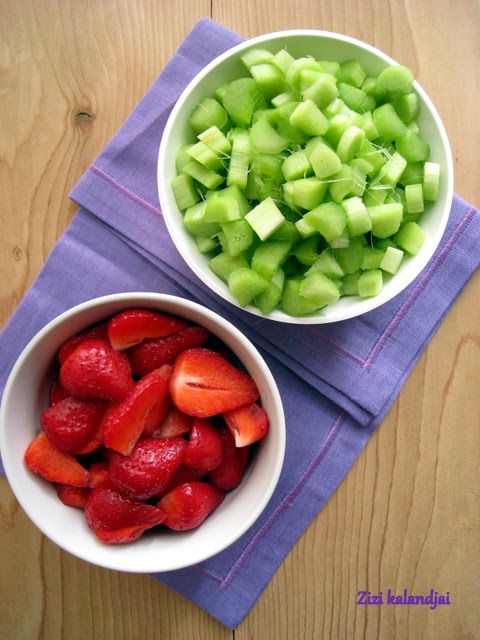 Peel the rhubarbs and with the strawberries cut them in small pieces. Place them in a baking dish. Mix the fruits with honey, cinnamon and lemon juice.
