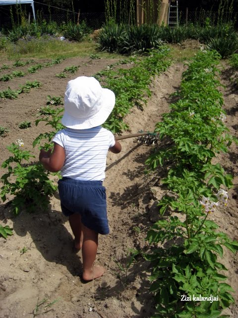 Vasárnap újabb tanyasi kalandban volt részünk. Nagyon meleg volt, a csapat egy része most tapasztalta meg életében először, hogy milyen érzés a forró nyári napon árnyék nélkül a földeken dolgozni. Hát, kemény… Noha ez az oktató tanya csak egy kisebb kertnek felel meg, azért mindig akad munka… akár 2 éves korban is el lehet kezdeni a krumpli ágyások kigazolását. Bence hatékony segítségnek bizonyult! 🙂