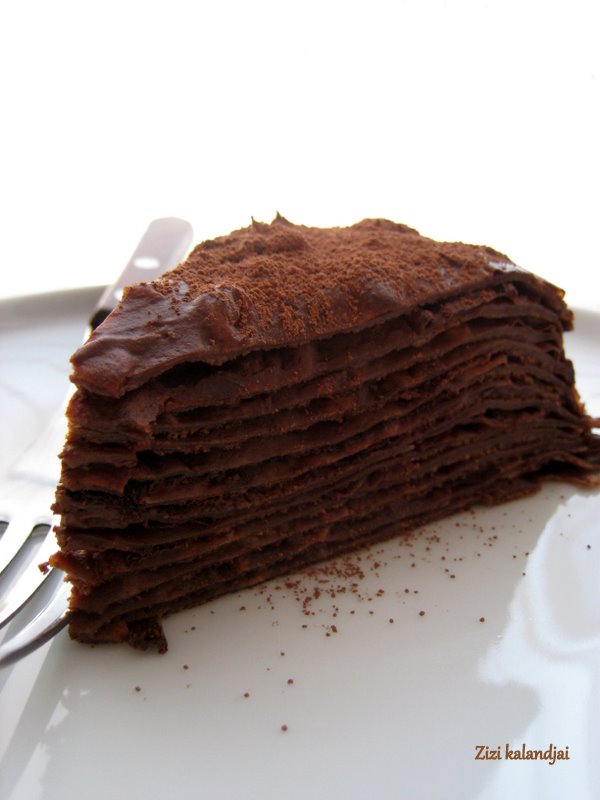 Megvárjuk, amíg a palacsinták kihűlnek, majd „megépítjük” a tortát. Legalulra palacsintát teszünk, a tetejét megkenjük a csokoládékrémmel, majd újra palacsinta, krém, amíg minden el nem fogy (nekem krém került legfelülre). A tetejére szórjunk kakaóport. Ha kibírjuk, fogyasztás előtt tegyük még hűtőbe legalább fél órára. Ha nem, vágjunk belőle egy szeletet és élvezzük a csoki által okozott boldogságot.