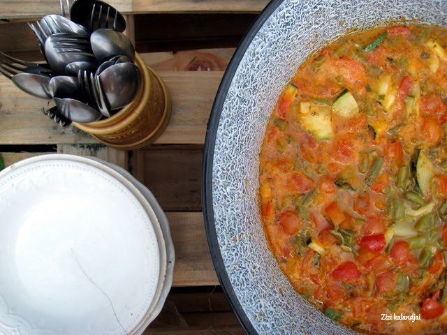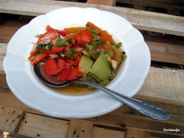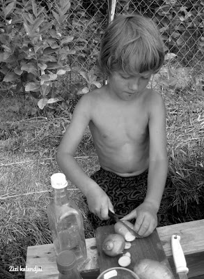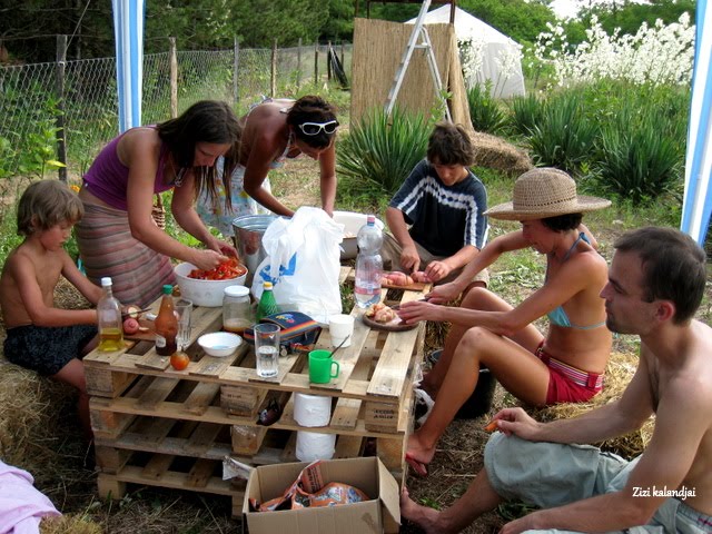 Az ebéd előkészületeit közösen csináltuk. A kétféle étel közül a babos-paradicsomos-cukkinis ragu készítését bevállaltam, a gulyáslevest pedig Zsoma főzte, a DNS Egyesület vezetője. Ez volt életem első önálló bográcsos főzése, amit nagyon élveztem. Persze az alapanyagokat frissen szedtük a kertből, ízük felülmúlta elvárásainkat. A cukkini zsenge volt és édeskés, a paradicsomok lédúsak és érezhető volt rajtuk a nap energiája.