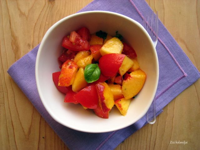 In a salad bowl mix together the peaches, tomatoes, basil leaves. In a smaller bowl make the dressing: mix together the garlic, apple vinegar, lemon juice, olive oil, pinch of salt and pepper and pour it over the salad.