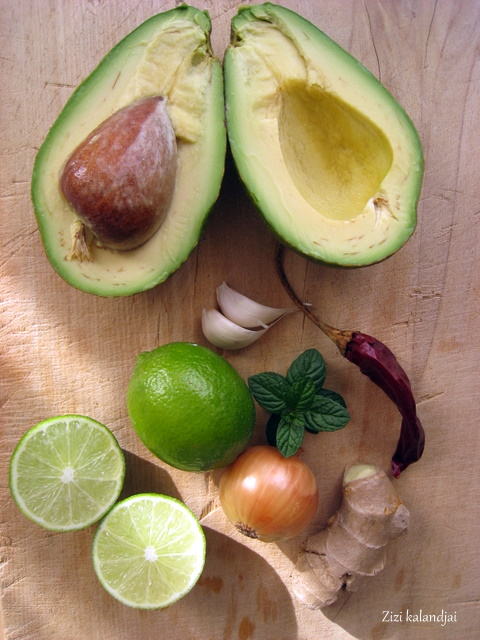 Egy lábosban hevítsük fel az olívaolajat, dinszteljük meg rajta a vöröshagymát, fokhagymát, chilit és a gyömbért. Vegyük le a tűzről, adjuk hozzá az avokádót, a lime levet, vizet, sózzuk, borsozzuk és botmixerrel pürésítsük krémesre. Ha túl sűrűnek találjuk, adjunk még hozzá egy kevés vizet.