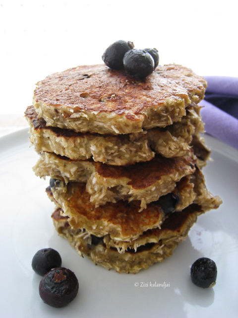 In a bowl whip the eggs and mix together with bananas. Add shredded coconut, cinnamon and blueberries and gently stir it together. Prepare a non-stick pan with 1 teaspoon coconut oil on medium heat. Spoon batter into pan, forming 2 small pancakes. Cook until golden brown on the bottom. Turn and brown the other side. You can serve it with blueberries, honey or maple syrup.