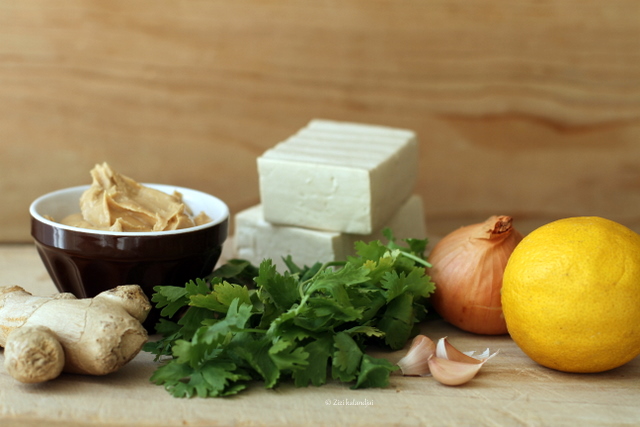 Heat the coconut oil in a pan, add chopped onion and garlic and saute for 5 minutes over medium heat. Add coriander stalks, curry powder, chili flakes and grated ginger. Continue to heat in the pan for another 2 minutes. Turn the heat down to low and stir in lemon juice, coconut milk and peanut butter. Continue to stir until everything is well combined and warmed through. Season with salt and before you serve sprinkle with coriander leaves.