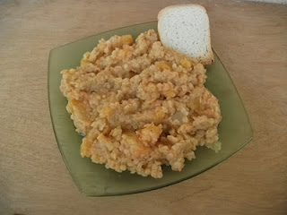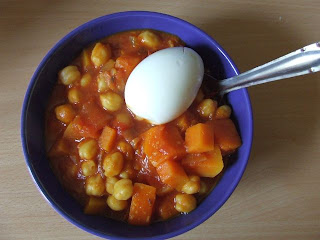Titi csicseriborsóval készítette el vegán sütőtök raguját. Magában is kiadós, hát még egy főtt tojással, amivel Titi fogyasztotta.
