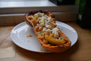 Csenge harmadik receptje egy töltött változat. A sütőtököt kölessel, lila hagymával, paprikával, mángolddal és fetával töltötte meg.