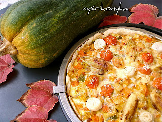 Évi sütőtökös zöldségpitét készített, sonkahagyma, fokhagyma, koktélparadicsom és kakukkfű is került bele.