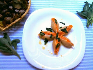 Judit ricottás sütőtökpürével töltötte meg az óriáskagyló, vagyis a conchiglie tésztákat, majd zsályavajjal locsolta meg.