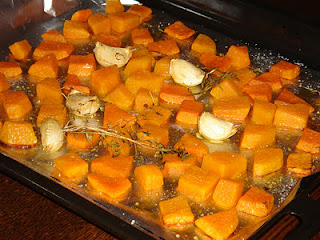 Kriszti szintén tepsiben sütötte ropogósra a sütőtök kockákat fokhagymával, kakukkfűvel, rozmaringgal.