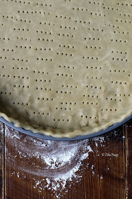 To make the crust, in a bowl mix together the flours, powder sugar and salt. Add the cubed butter and mix until the butter pieces are broken up and about the size of small peas. Add cold water and mix until the dough comes together. Form the dough into a ball, wrap in a clingfilm and let it rest in the fridge for at least 30-40 minutes. Preheat the oven to 180C (350F). After resting the dough, roll out the pastry on a floured surface to cover your pie dish (diameter: 29-30 cm) and prick holes with a fork all over the pastry (this helps the steam escape and prevents the crust from bubbling up). Line the pie crust with parchment paper, then fill with dried peas, lentils, beans or other pulses, or with ceramic or metal „baking beans” (also called pastry weights or pie weights) so that it will keep its shape when baking. Bake at 180C (350F) for about 15 minutes until it gets golden brown. Set aside.
