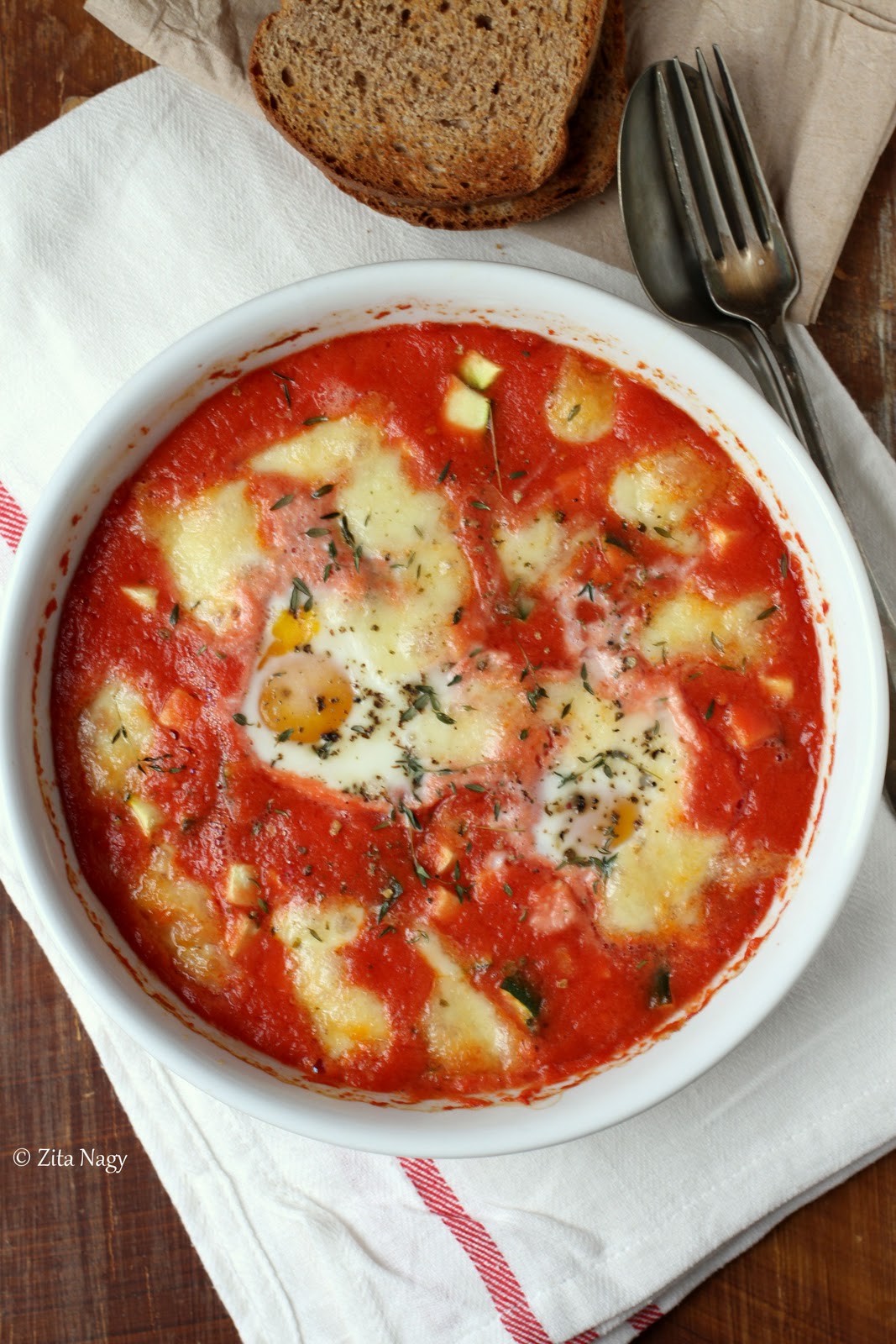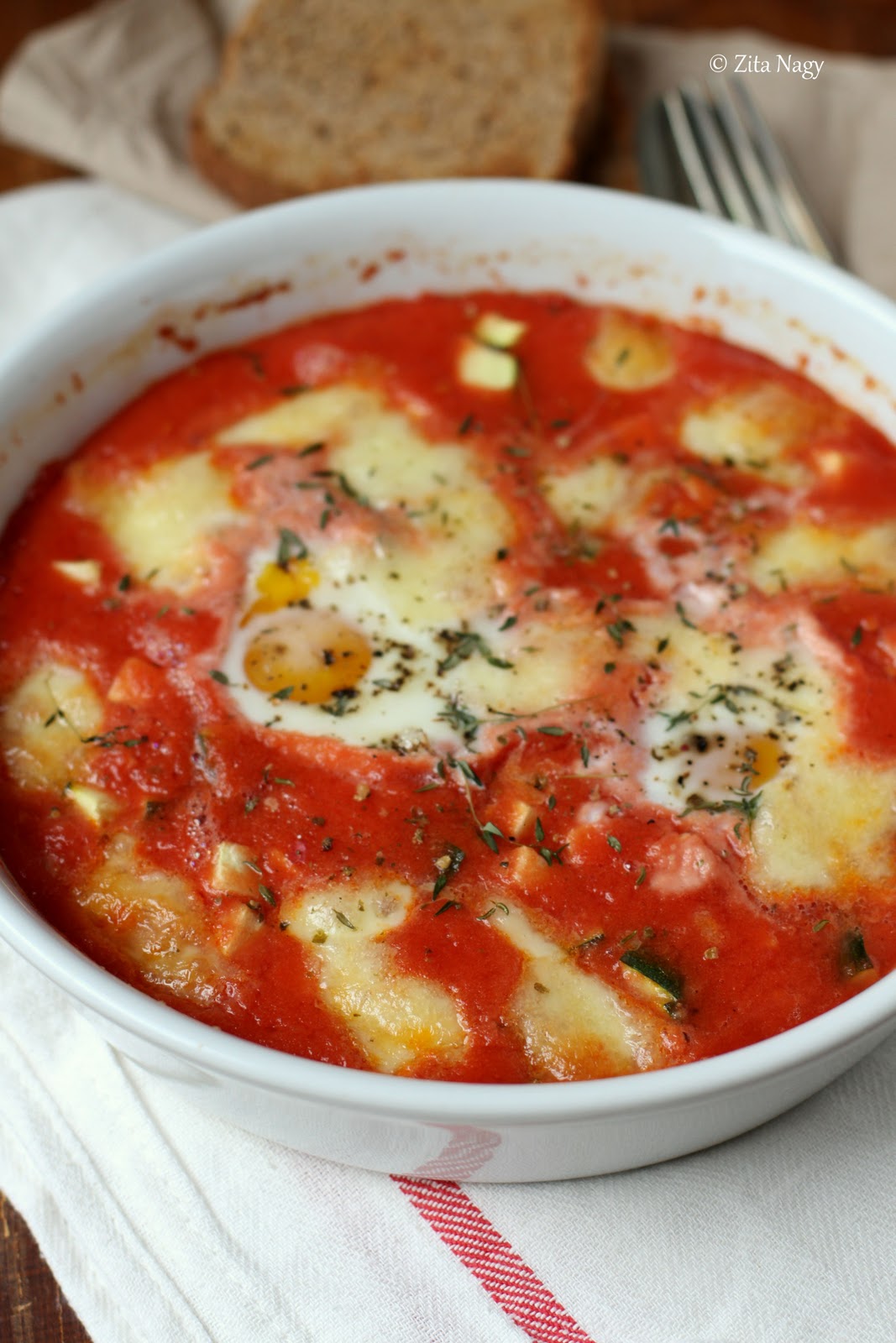Egy sütőtálkába öntsünk bele a paradicsomlevet, sózzuk, borsozzuk és keverjük össze. Adjuk hozzá a felkockázott cukkinit, a fokhagymát és tépkedjük bele a mozzarellát. Üssük bele a két tojást, szórjuk meg a kakukkfűvel, a chili pehellyel és locsoljuk meg két teáskanálnyi olívaolajjal. Előmelegített sütőben süssük 180 fokon 15-20 percig, amíg a tojások megsülnek, a mozzarella pedig elolvad. Fokhagymás pirítóssal tálaljuk.