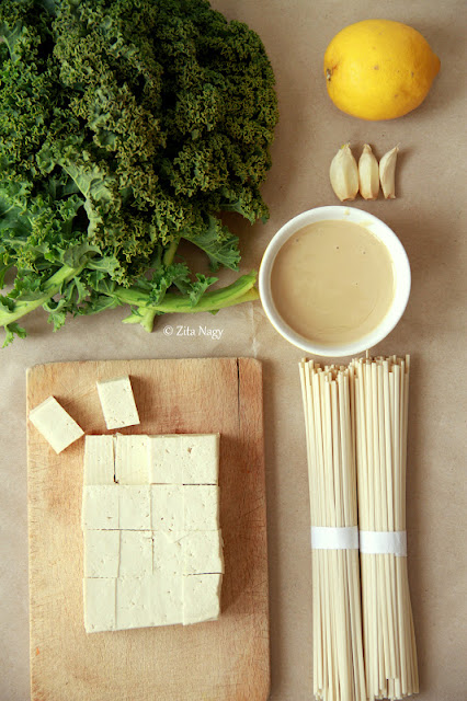 Udon tészta pirított leveleskellel és tofuval krémes citromos tahini szószban