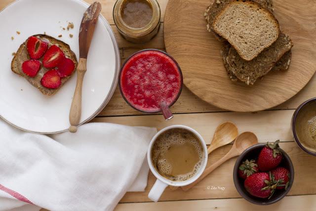 A recept nagyon egyszerű, igazából nem is recept, csak egy ötlet arra, hogy ilyet is lehet reggelizni. Mindenkinek a saját ízlésére bízom, hogyan ízesíti a pirítóst, milyen gyümölccsel eszi. Mi juharsziruppal locsoltuk meg, a gabonakávét pedig kókuszcukorral édesítettük. A kávé nagyon krémes, selymes állagú lett a mandulatejtől. Fantasztikus!
