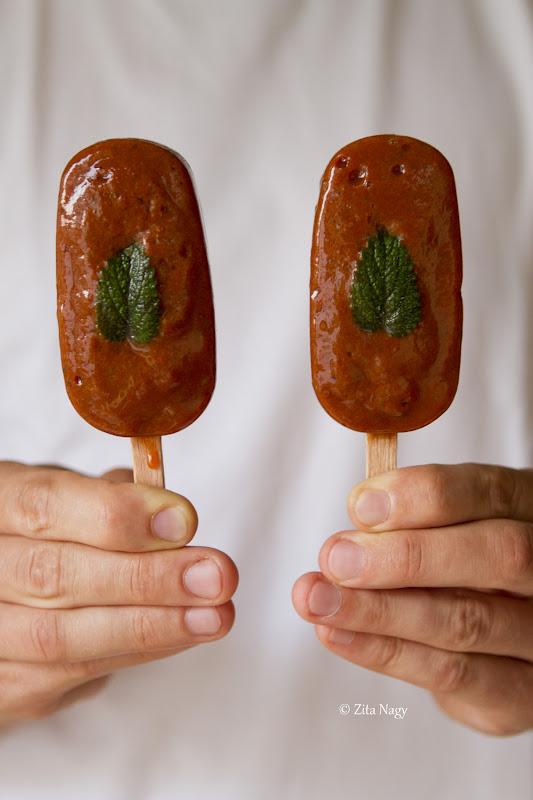 A hozzávalókat turmixoljuk össze és öntsük a formákba. Helyezzünk mindegyikbe pálcikát – díszíthetjük egy-egy citromfű levéllel a jégkrémeket – és tegyük mélyhűtőbe kb. 2 órára, amíg megszilárdulnak.