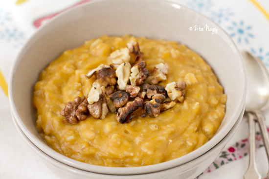 A zabkását (angolul porridge) még Angliában szerettem meg, amikor ott éltem és egy étteremben dolgoztam. Egyszer egy vendég ezt kérte reggelire. Megkérdeztem tőle, hogy mi ez. Aztán beszaladtam a konyhába és elkészítettem életem első zabkásáját úgy, hogy magamnak is hagytam egy keveset. A reggel sikerrel zárult. A vendég elégedetten távozott, én pedig jóllakottan végeztem tovább a munkám. A zabkása igen laktató és egészséges reggeli, tele jó sok rosttal. Én mindig növényi tejjel (mandula-, zab- vagy rizstej) készítem, mert ezek édesebb ízűek, mint a tehéntej, így néha kibírom, hogy nem adok hozzá semmilyen édesítőszert, csak szárított gyümölccsel és pirított magvakkal eszem. Most viszont adtam hozzá egy kis juharszirupot, amelynek a karamelles íze kiváló párost alkot a sütőtökkel és a dióval. Igazi őszi harmónia ízben és színben egyaránt egy kis tálkában. Hát lehet ennek ellenállni?