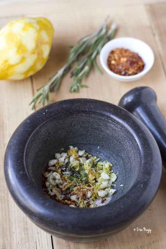 Tegyük egy mozsárba a citromhéjat, a fokhagymát, a chili pelyhet, a rozmaringot, a kakukkfüvet, valamint a sót és a borsot és törjük ezt a fűszeres keveréket minél apróbbra. Adjuk hozzá az olívaolajat és citromlevet és jól keverjük el.